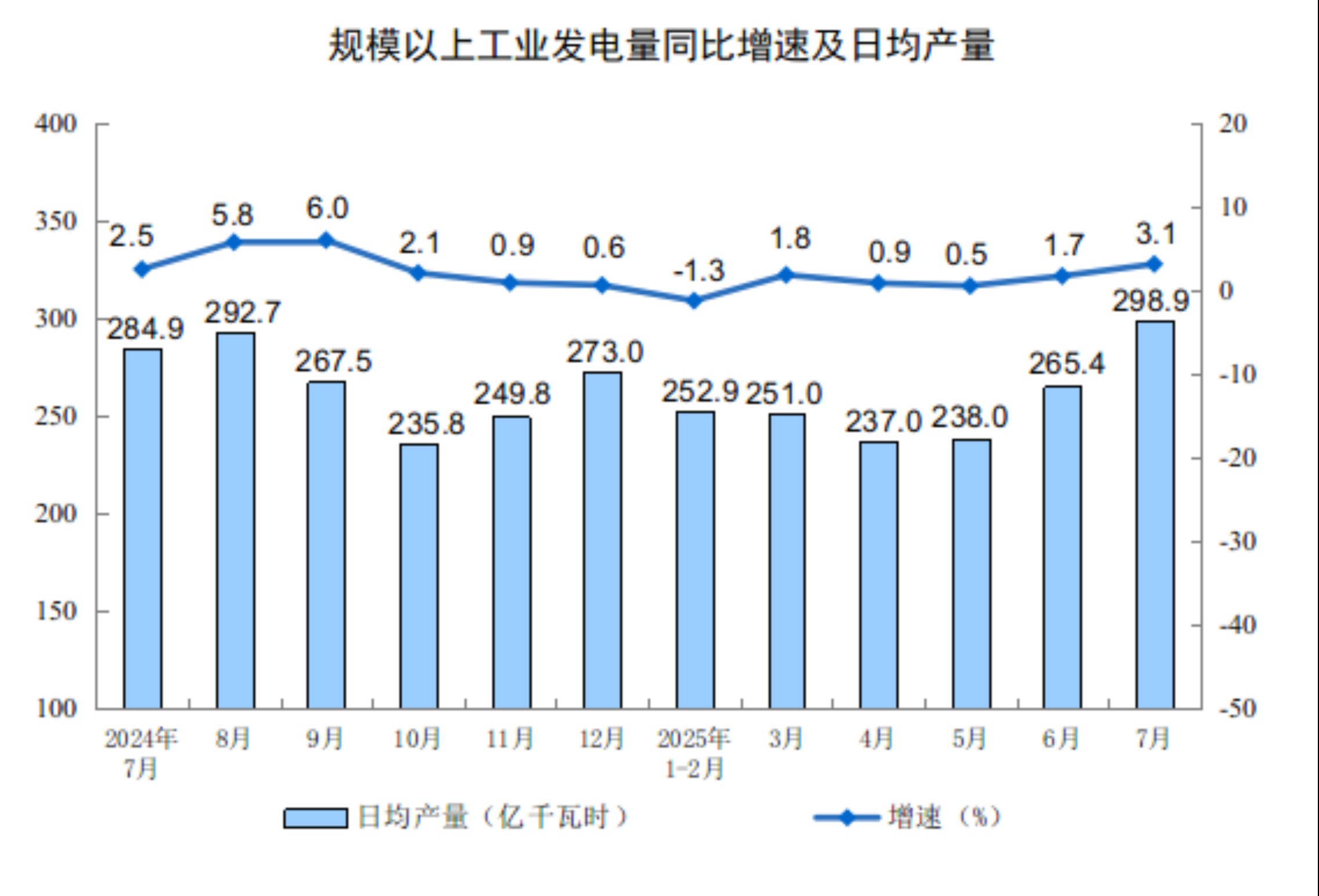 分产品看,7月份,规模以上工业623种产品中有335种产品产量同比增长。其中,钢材12295万吨,同比增长6.4%;水泥14557万吨,下降5.6%;十种有色金属681万吨,增长2.2%;乙烯312万吨,增长9.1%;汽车251.0万辆,增长8.4%,其中新能源汽车117.6万辆,增长17.1%;发电量9267亿千瓦时,增长3.1%;原油加工量6306万吨,增长8.9%。
