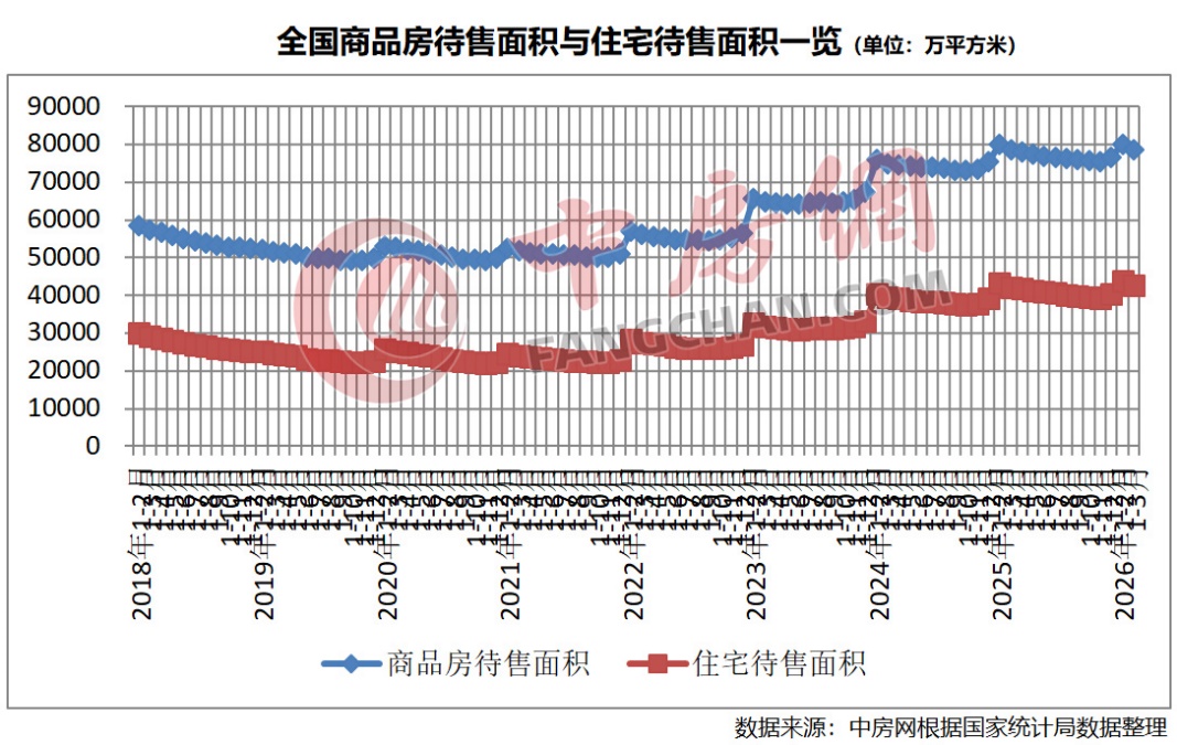 商品房库存方面,截至3月末,商品房待售面积78601万平方米,同比下降0.1%。其中,待售3年以下面积59012万平方米,下降1.8%。此外,住宅待售面积为42771万平方米,同比增长1.4%。