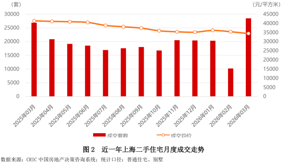 克而瑞数据显示,2026年3月上海二手房成交总量31436套,其中二手住宅成交量达28492套,环比大幅上涨178.79%,同比上涨6.0%。然而,伴随成交量暴涨的是成交均价的持续下行,3月成交均价为34429元/㎡,环比下跌2.85%,同比下跌16.79%,市场“以价换量”特征明显。